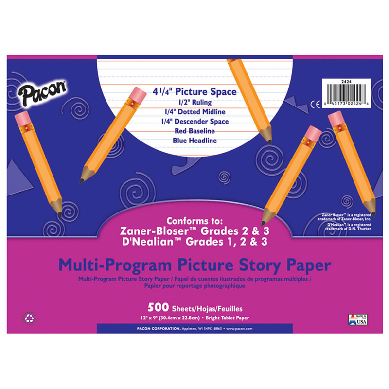 12 x 9 in Picture Story Paper 05 in Rule 2 Ream 500 Sheet Per Pack Our Pacon MultiProgram Handwriting Papers offer rulings that conform to both the ZanerBloser and DNealian handwriting programs Bright tablet paper is ruled on both sides with red baselines blue dotted midlines and blue headlines Features. Picture Story paper is ruled with a 45 picture space on both sides. These tablets have a heavy chipboard back and protective front cover. Recyclable. 500 sheets each bundle of 2 packs 1000 sheets totalSpecifications. Size 12 x 9 in