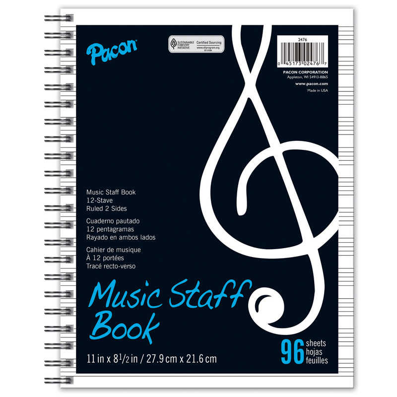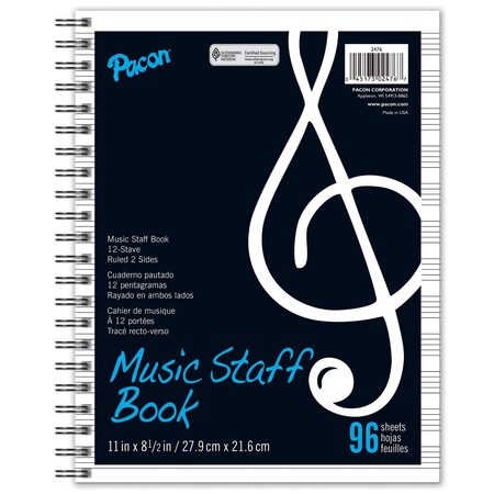 Pacon Music Staff Paper, Spiral Bound Book, 11" x 8-1/2", 96 Sheets