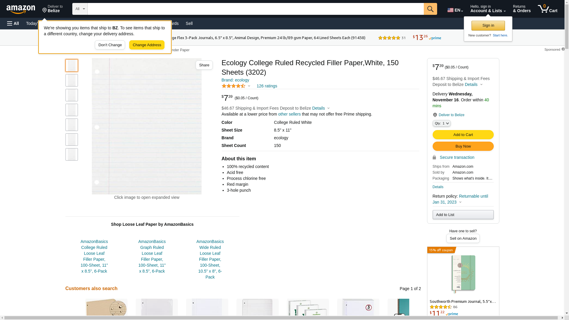 Ecology College Ruled Recycled Filler Paper,White, 150 Sheets (3202)