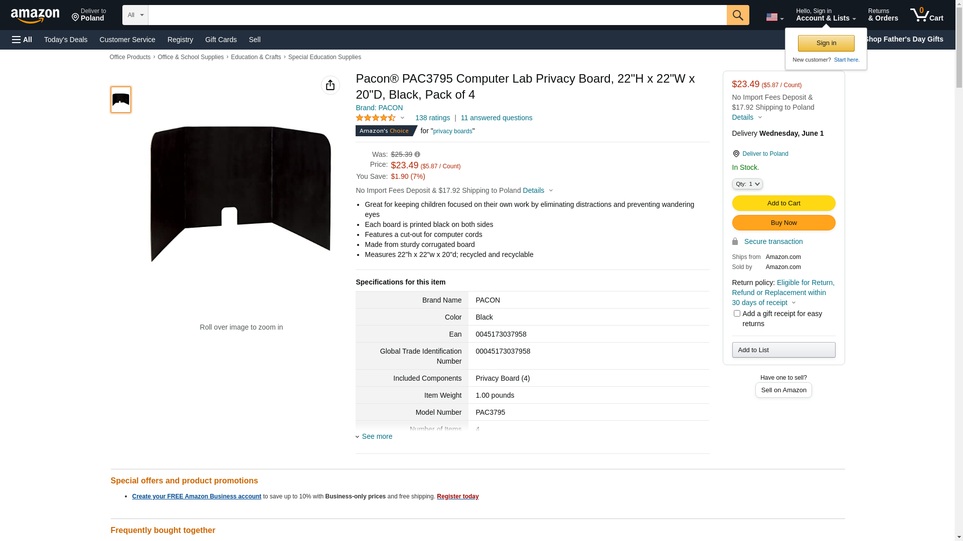 PaconĀ® PAC3795 Computer Lab Privacy Board, 22"H x 22"W x 20"D, Black, Pack of 4