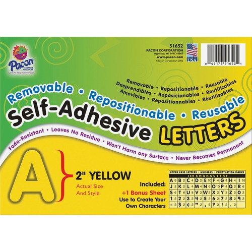 Pacon Reusable Self-Adhesive Letters - (Uppercase Letters, Number, Punctuation Marks) Shape - Self-Adhesive - Acid-Free, Fadeless - 2" Length - Puffy Font - Yellow - 159 / Pack