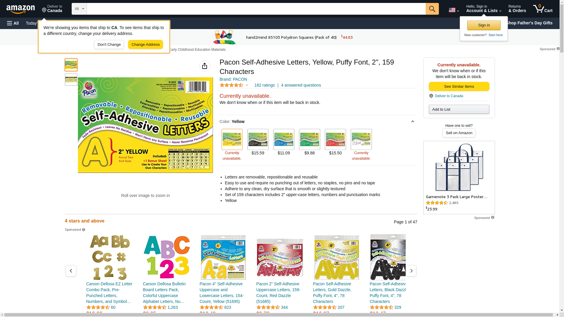 Pacon Self-Adhesive Letters, Yellow, Puffy Font, 2", 159 Characters