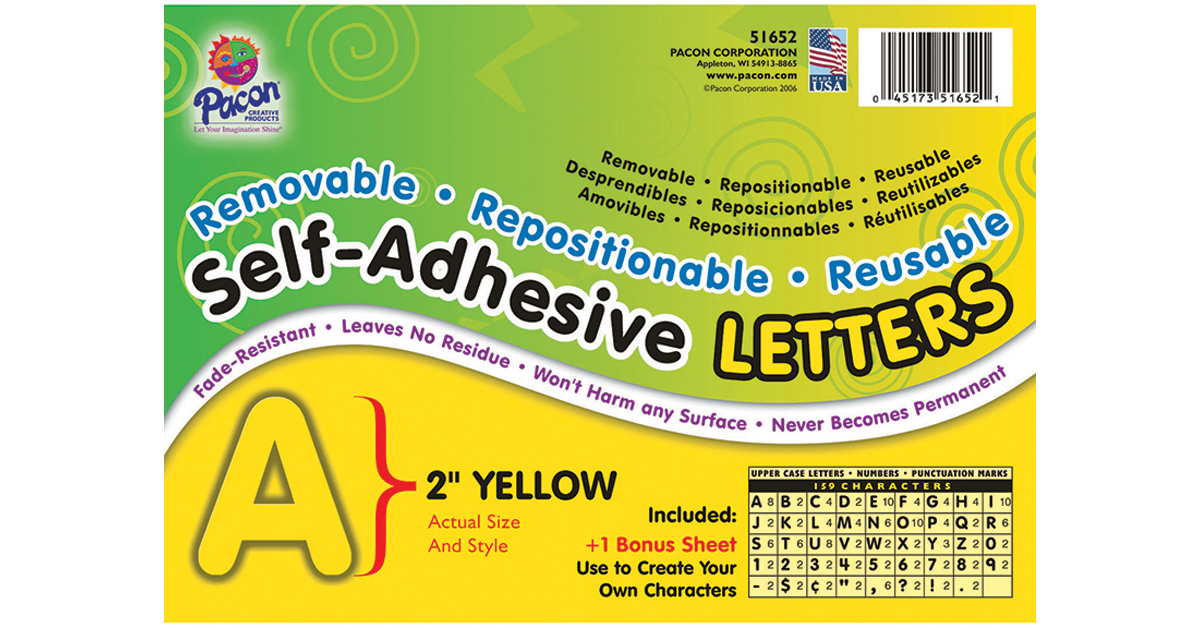 Self-adhesive letters are removable, repositionable and reusable. Letters are easy to use and require no punching out of letters, no staples, no pins and no tape. Simply peel and place. Self-adhesive letters adhere to any clean, dry surface that is smooth or slightly textured (even wood and a painted brick wall). They are fade-resistant and acid-free. Unique adhesive leaves no residue and never become permanent. Set of 159 characters includes 2" uppercase letters along with numbers and punctuation marks. Ideal for bulletin boards, signs, posters, presentation boards and much more.