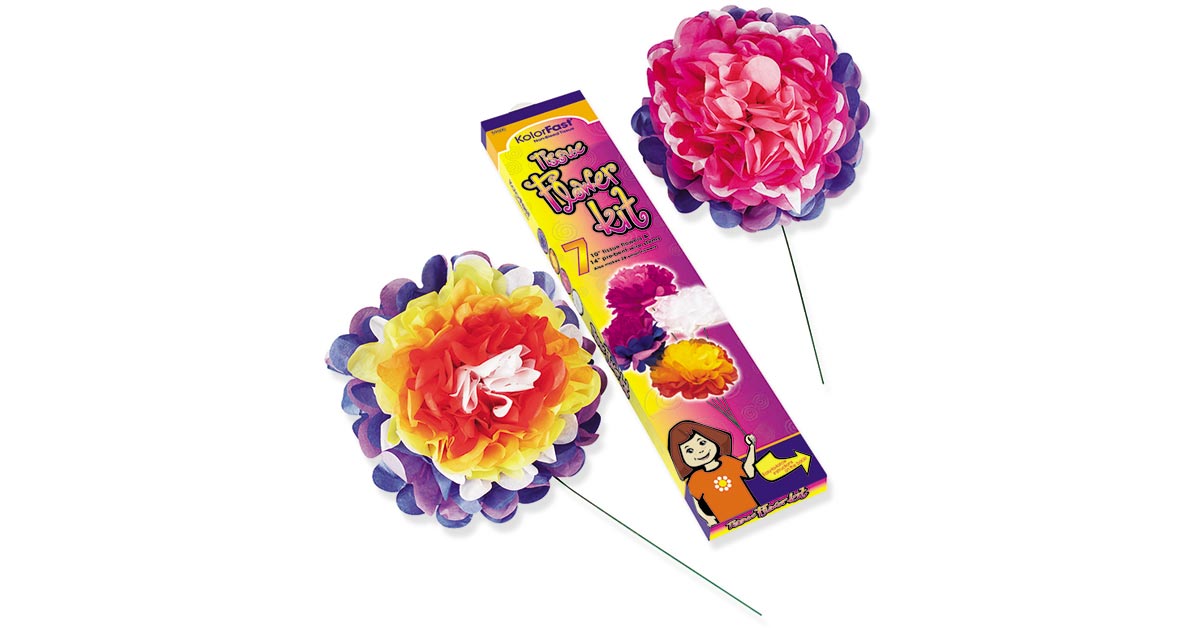 Create beautiful, brightly colored, 10" tissue flowers using this KolorFast Tissue Flower Kit. Simply accordion-fold tissue, attach stem and primp tissue to create a readymade bouquet, centerpiece or party decoration. This flower kit contains instructions, wire stems and enough pre-cut KolorFast Tissue with scalloped edges to create seven flowers. Tissue is nonbleeding.