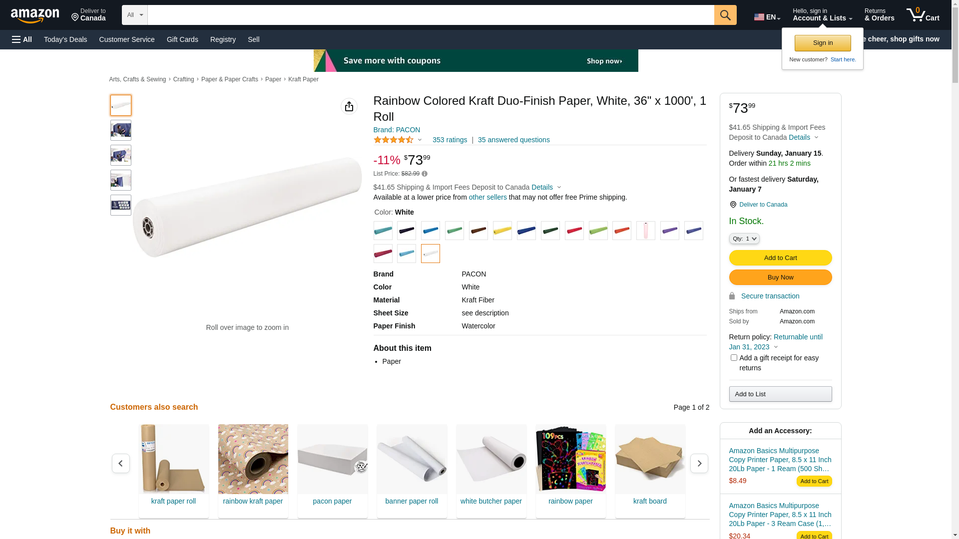Rainbow Colored Kraft Duo-Finish Paper, White, 36" x 1000', 1 Roll