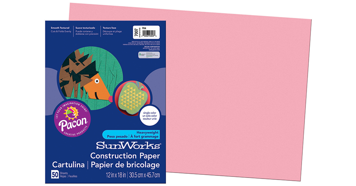 Pacon Sunworks Construction Paper- Color: pink- Size: 12 in. x 18 in.Brightly colored, all-purpose, high bulk, high strength, smooth textured heavyweight groundwood construction paper with long, strong fibers that cut clean and fold evenly without cracking.Electricity used to make this paper is generated from 100% hydro powerIt is also made with a chemical-free pulping process to help ensure a cleaner environmentRecyclableEach pack contains 50 sheets Warehouse group number: 816