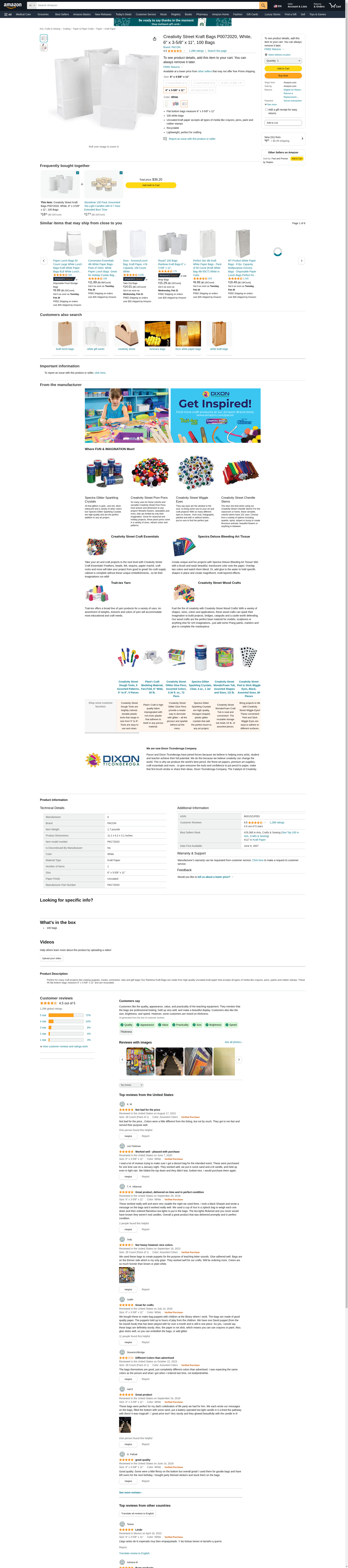 Creativity Street Kraft Bags P0072020, White, 6" x 3-5/8" x 11", 100 Bags