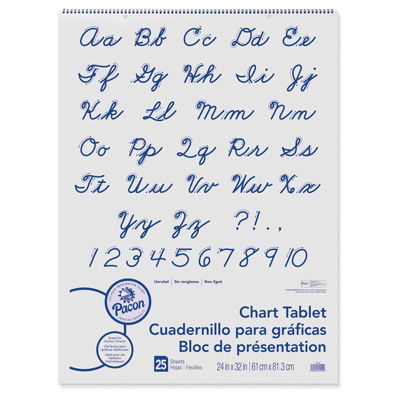 - 24" x 32". 25 Sheets/Pad, 2 Packs. Features each uppercase and lowercase letter written in cursive as well as numbers 1 through 10.