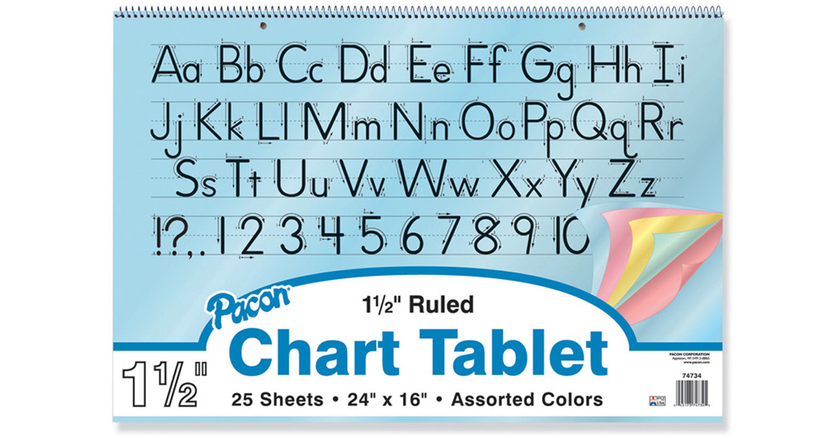 - Chart Tablet contains 25 sheets of pastel-colored bond paper and a cover with the alphabet in manuscript. Each sheet is 1-1/2" ruled the long way and two-hole punched for storage in binders. The stiff cover and paper are spiral-bound at the top. Assorted colors of pages include yellow, pink, salmon, blue and green.