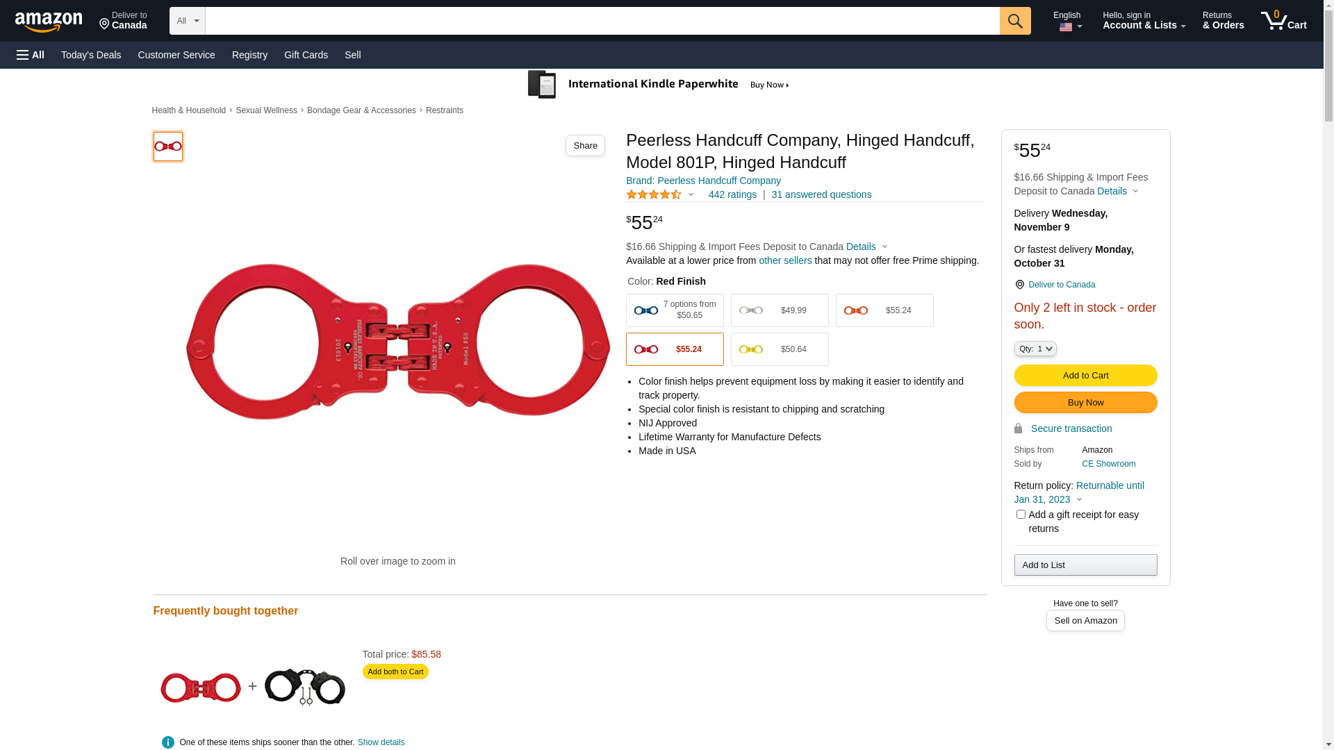Peerless Handcuff Company, Hinged Handcuff, Model 850R, Hinged Handcuff - Red Finish