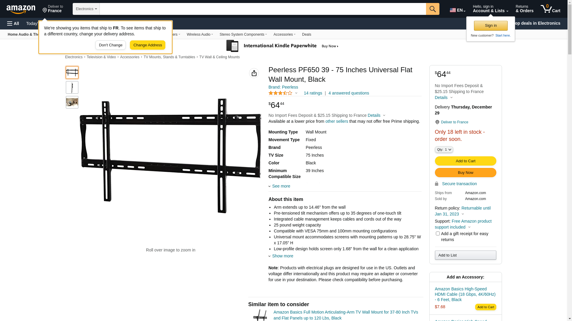 Brand Name: Peerless-AV<br /> Product Line: Paramount<br /> Product Model: PF650<br /> Product Name: Paramount PF650 Universal Flat Panel Wall Mount<br /> Product Type: Wall Mount<br /> Device Supported: Flat Panel Display<br /> Maximum Load Capacity: 175.00 lb<br /> Minimum Screen Size Supported: 32"<br /> Maximum Screen Size Supported: 50"<br /> Color: Black<br /> Height: 17.1"<br /> Width: 28.8"<br /> Weight (Approximate): 9.00 lb<br /> Compatibility: 32" to 50" Flat Panel Screens