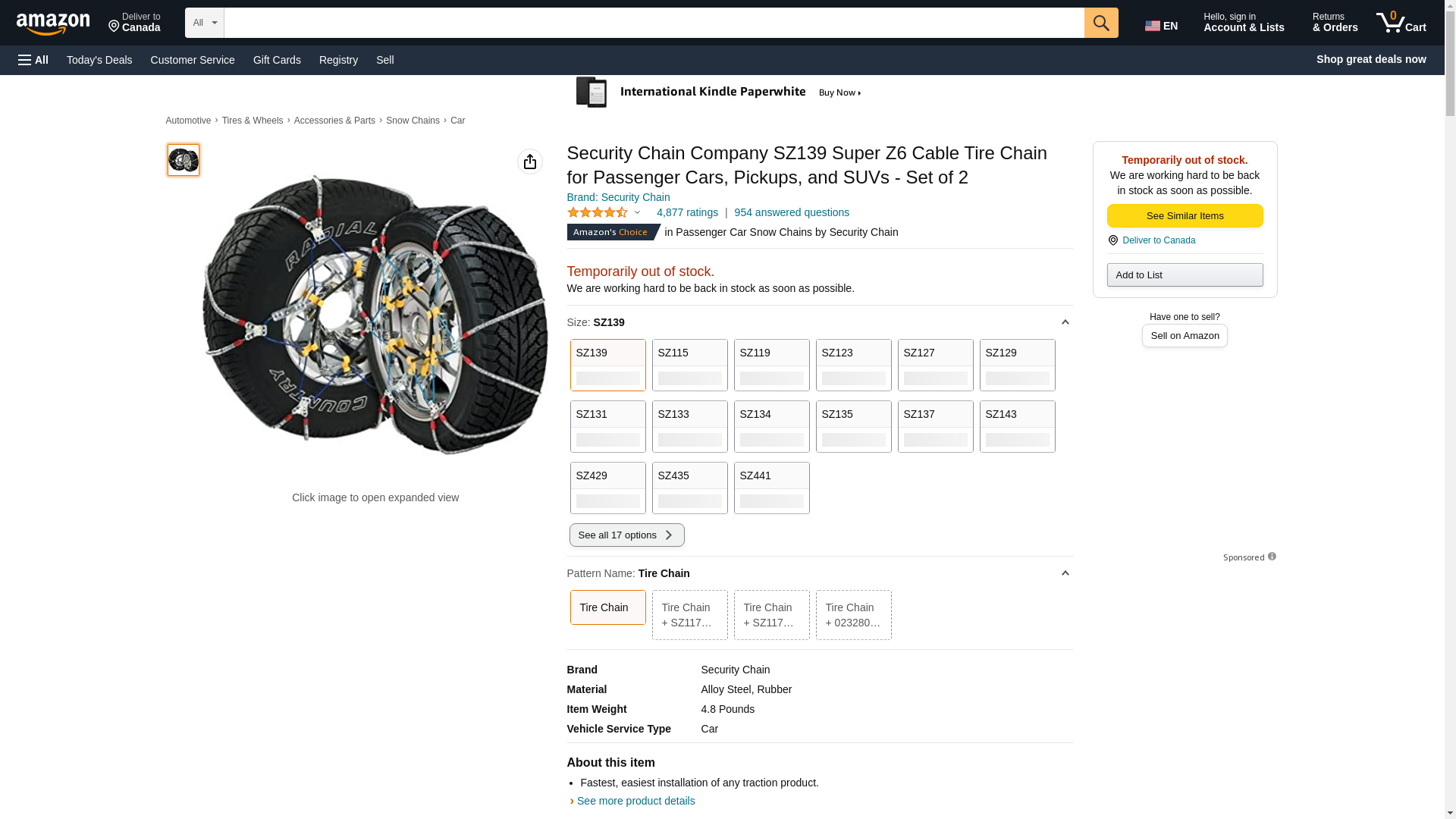 | Feature | <b>Price For:</b> Each <b>Type</b>: Passenger, Pickup/SUV <b>Item</b>: Tire Chain <b>Includes</b>: Chain Tighteners <b>Country of Origin (subject to change)</b>: China |