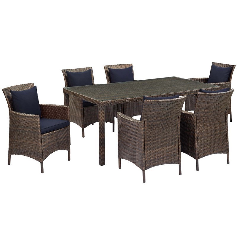 MODWAY EEI-4032-BRN-NAV-SET CONDUIT 7 PIECE OUTDOOR PATIO WICKER RATTAN DINING SET, BROWN NAVY