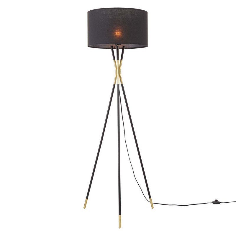 Introduce timeless illumination into your living room, bedroom, or office with the exquisite Audrey Floor Lamp. Standing elegantly on a black matte tripod base, effortlessly carrying the oversized black drum fabric shade, Audrey complements mid-century modern, minimalist, or eclectic decors. Satin brass details at the tip of each leg and where the legs converge add refinement to this sophisticated floor lamp for the living room. Audrey comes equipped with a black power cord and an On/Off foot switch. This floor lamp requires 1 E26 bulb, 40W max, or LED equivalent (not included).<br/><br/>Features :<br/><br/>- Material: Metal, fabric<br/>- Finish: Black, gold<br/>- Black floor power cord<br/>- Led compatible.<br/><br/>Specifications :<br/><br/>- Product Dimensions : 60"H x 20"W x 20"D<br/>- Product Weight : 9 lbs<br/>- Number of Lights : 1<br/>- Bulb Type : E26<br/>- Wattage : (Max) 40W.