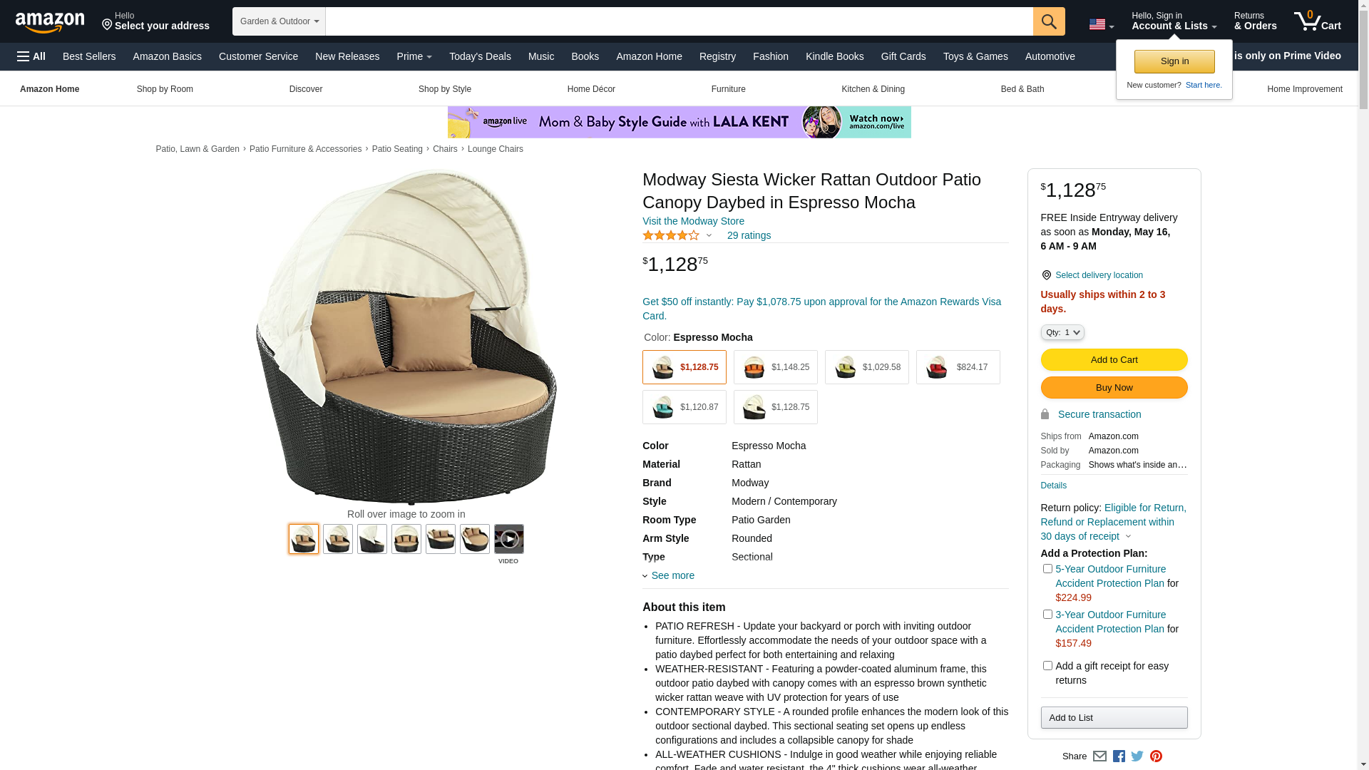 Siesta Collection EEI-642-EXP-MOC Canopy Outdoor Patio Daybed with Water Resistant, Powder Coated Aluminum Frame, Synthetic Rattan Weave and Fabric Cushion Covers in Espresso and Mocha Color