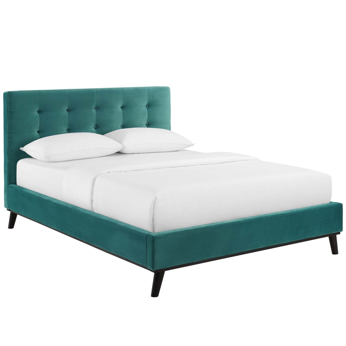 McKenzie Collection MOD-6006-TEA Queen Size Platform Bed with Splayed Legs, Wood Slat Support System, Rubberwood Frame and Stain-Resistant Velvet Fabric Upholstery in Teal Color