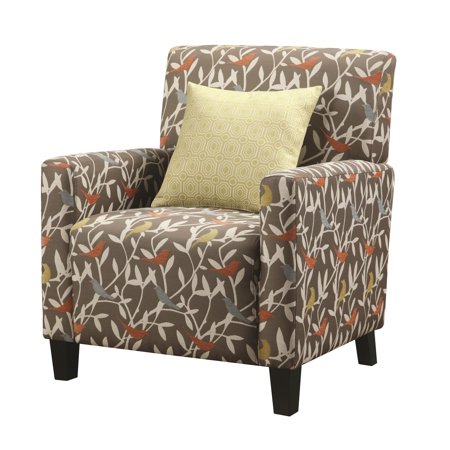 AOAS1220 <br /> <strong>Features</strong> <br /> <li>Fabric: Grey bird print with yellow accent pillow</li> <li>Arm chair background color: Gray</li> <li>Frame Finish: Espresso</li> <li>Upholstered: Yes</li> <li>Frame Material: Wood</li> <li>Number of Items Included: 2</li> <li>Pieces Included: Chair, 1 accent pillow</li> <li>Upholstery Color: Multi-colored</li> <li>Upholstery Material: Foam</li> <li>Arm Material: Fabric</li> <br /> <strong>Dimensions</strong> <br /> <li>Overall Height - Top to Bottom: 34.5''</li> <li>Overall Width - Side to Side: 32''</li> <li>Overall Depth - Front to Back: 30''</li> <li>Overall Product Weight: 43 lbs</li>