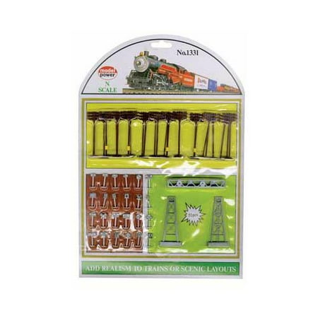 <br />N Scale Tracksider Accessory Assorted. This is a 51 piece set with signs, posts, and bridges for N scale trains. Features: 24 Brown power line poles, 1 Gray signal bridge (3 pieces snap into one bridge), 24 Street signs (RR crossing, stop signs, speed limit signs, and so on). <br /> <br /> Manufacturer: Model Power <br /> Model Number: 1331 <br /> <br /> Scale/Era: N Scale <br /> Model Type: Accessories <br /> <br /> <br />