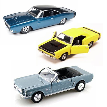 <ul><li>1964.5 Ford Mustang Convertible, Blue - Motormax Premium American 73212 - 1/24 Scale Diecast Model Car</li><li>1969 Custom Dodge Charger 500, Blue with Black Roof - Auto World AW24005 - 1/24 Scale Diecast Model Toy Car </li><li>1969 Dodge Coronet Super Bee, Yellow With Black Hood - Motormax Premium American 73315 - 1/24 Scale Diecast Model Car</li></ul><br><br>73212-MMT-BLUE,AW24005-ERTL-BLUE,73315-MMT-YELLOW
