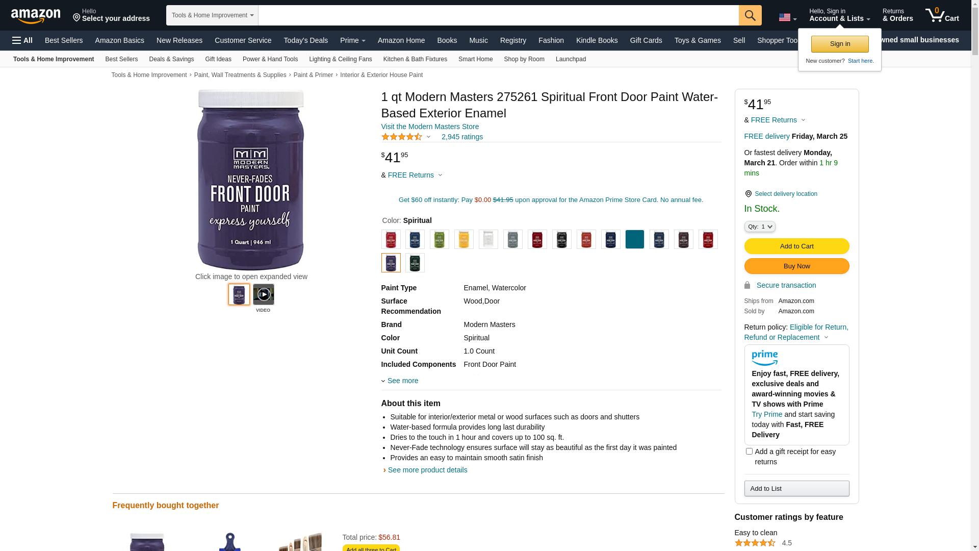 Modern Masters 1 qt. Satin Spiritual Express Yourself Front Door Paint is a high-quality, durable paint that allows you to change the look of your whole house in just one day. Formulated with never-fade technology, the color withstands the elements to retain a rich and vibrant look as time passes. Quick-dry formula allows easy completion of projects with no mess or heavy lifting. Simply leave your door on its hinges, paint and close the same day with no mess.
