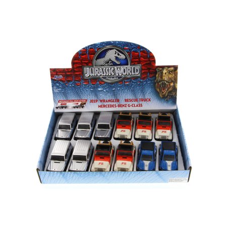 <b>Get a full box of diecast vehicles at a discounted price! Perfect for diecast collectors who are looking to add Jurassic World Rescue Truck to their collection! <br /><br />Diecast Package includes Jurassic World Rescue Truck -- 12-piece assortment, featuring the following items: </b> <ul> <li>Jurassic World Rescue Truck, Dark Blue - JADA 97148 - 1/43 Scale Diecast Model Toy Car</li> <li>Jurassic World 1992 Jeep Wrangler, White with Orange - JADA 97148 - 1/43 Scale Diecast Model Toy Car </li> <li>Jurassic World Mercedes-Benz G550 4x4, Candy Silver - JADA 97148 - 1/43 Scale Diecast Model Toy Car</li> </ul> <br /> <br />97148-JADA-BLUE,97148-JADA-WHITE,97148-JADA-SILVER,,,
