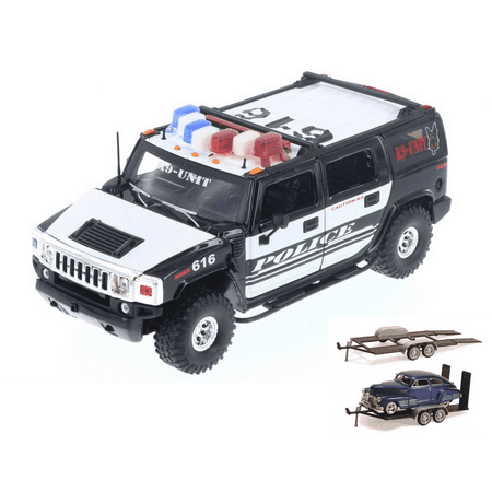 <b>NOTE: The blue car shown in the picture of the trailer is NOT included in this package, it is only shown to illustrate how the trailer works.</b> <br /> <br /> <b>NOTE: The vehicle in this bundle does NOT have a hitch -- the trailer cannot be connected, it is just for display purposes.</b> <br /> <br /> <b>2-piece Diecast Package Includes: </b> <ul> <li>2011 Hummer H2 Police K-9 Unit, Black & White - Jada 50549-K9 - 1/24 Scale Diecast Model Toy Car</li> <li>Trailer Car Carrier - Motormax 76001 - 1/24 scale Diecast Model Trailer </li> </ul> <br /> <br />50549-K9-JADA-BLACK,76001-MMT