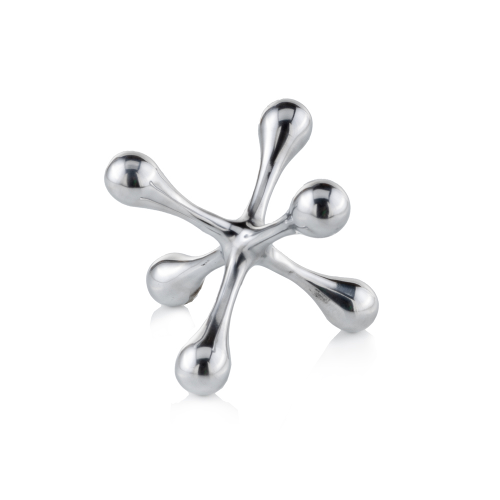 - PRODUCT DIMENSIONS: 5"L x 5"W x 4"H WEIGHT 0.65LBS This decorative jack is the smallest of 3 sizes (sold separately). The Cantillo Decorative Jack incorporates 6 long linear arms in buffed aluminum casted shiny silver and finished with semi-oblong circular balls.