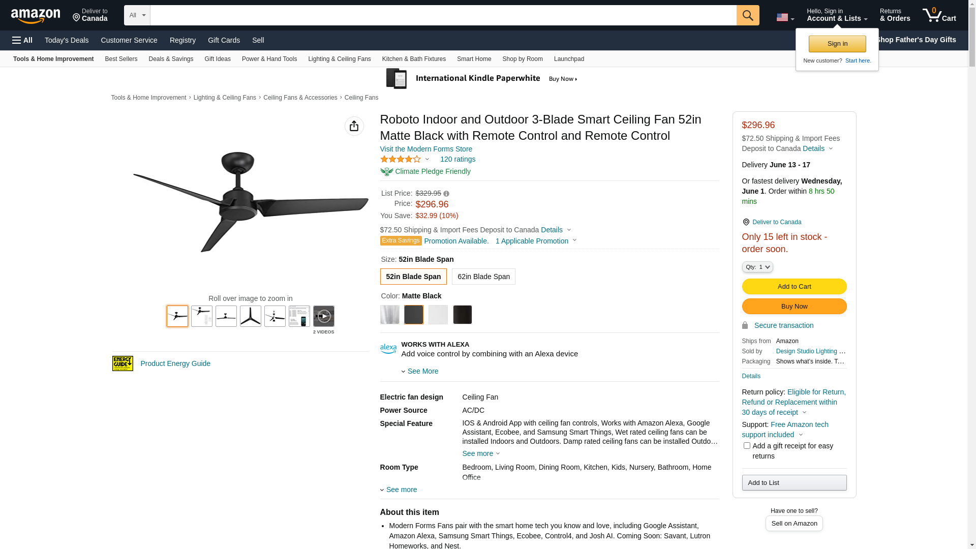 Roboto Smart Indoor and Outdoor 3-Blade Ceiling Fan 52in Matte Black with Remote Control works with Alexa, Google Assistant, Samsung Things, and iOS or Android App