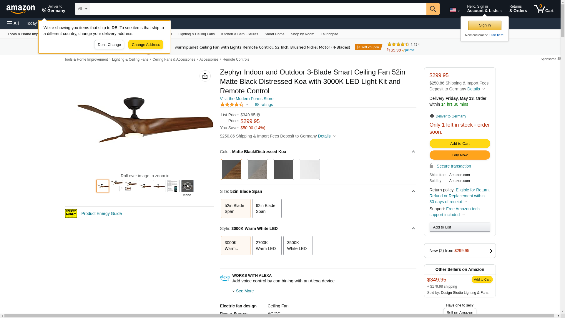 Zephyr Smart Indoor and Outdoor 3-Blade Ceiling Fan 52in Matte Black Distressed Koa with 3000K LED Light Kit and Remote Control works with Alexa, and iOS or Android App