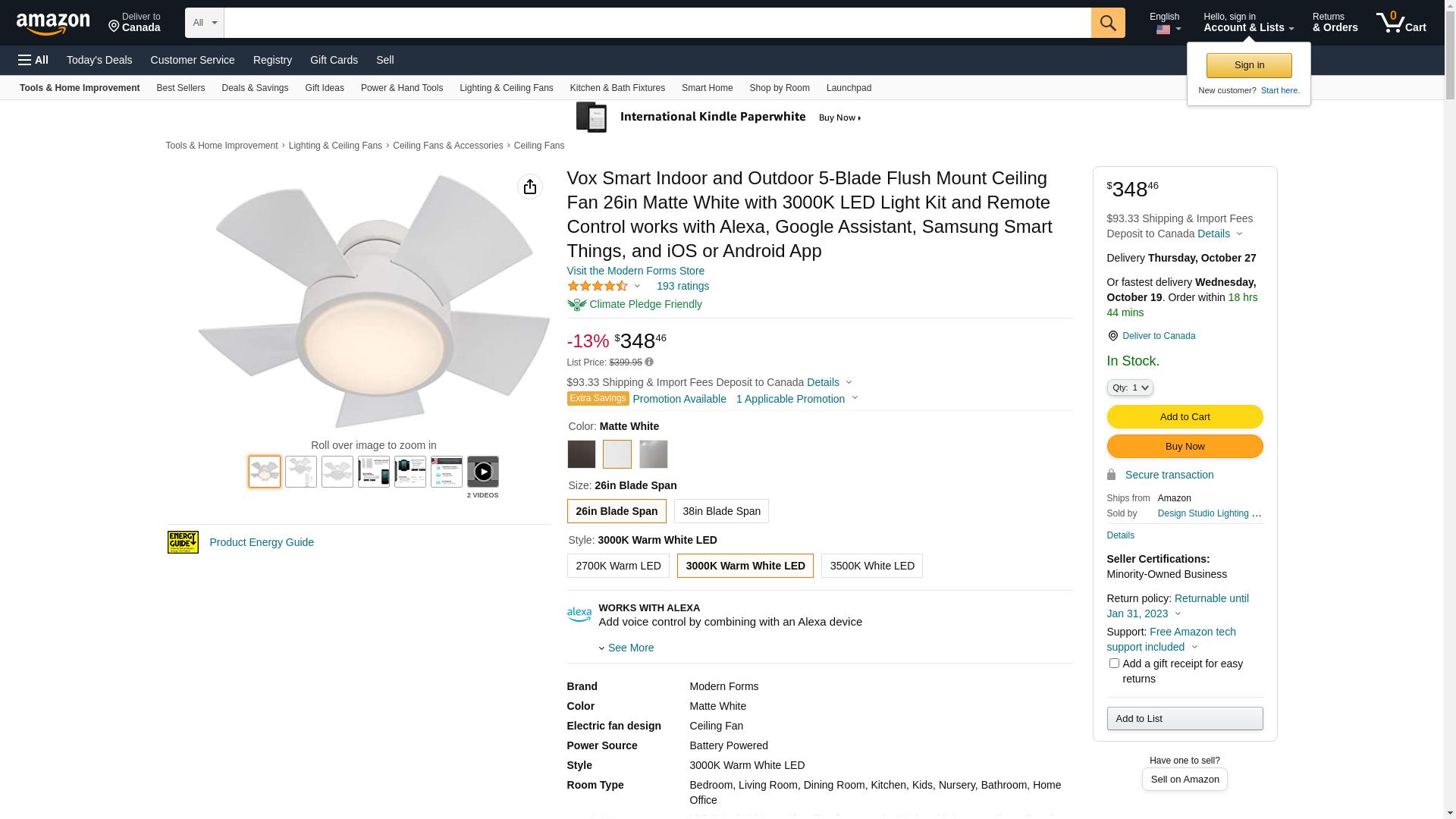 Vox Indoor/Outdoor 5-Blade Smart Flush Mount Ceiling Fan 26in Matte White with 3000K LED Light Kit and Wall Control works with iOS/Android, Alexa, Google Assistant, Samsung SmartThings, and Ecobee