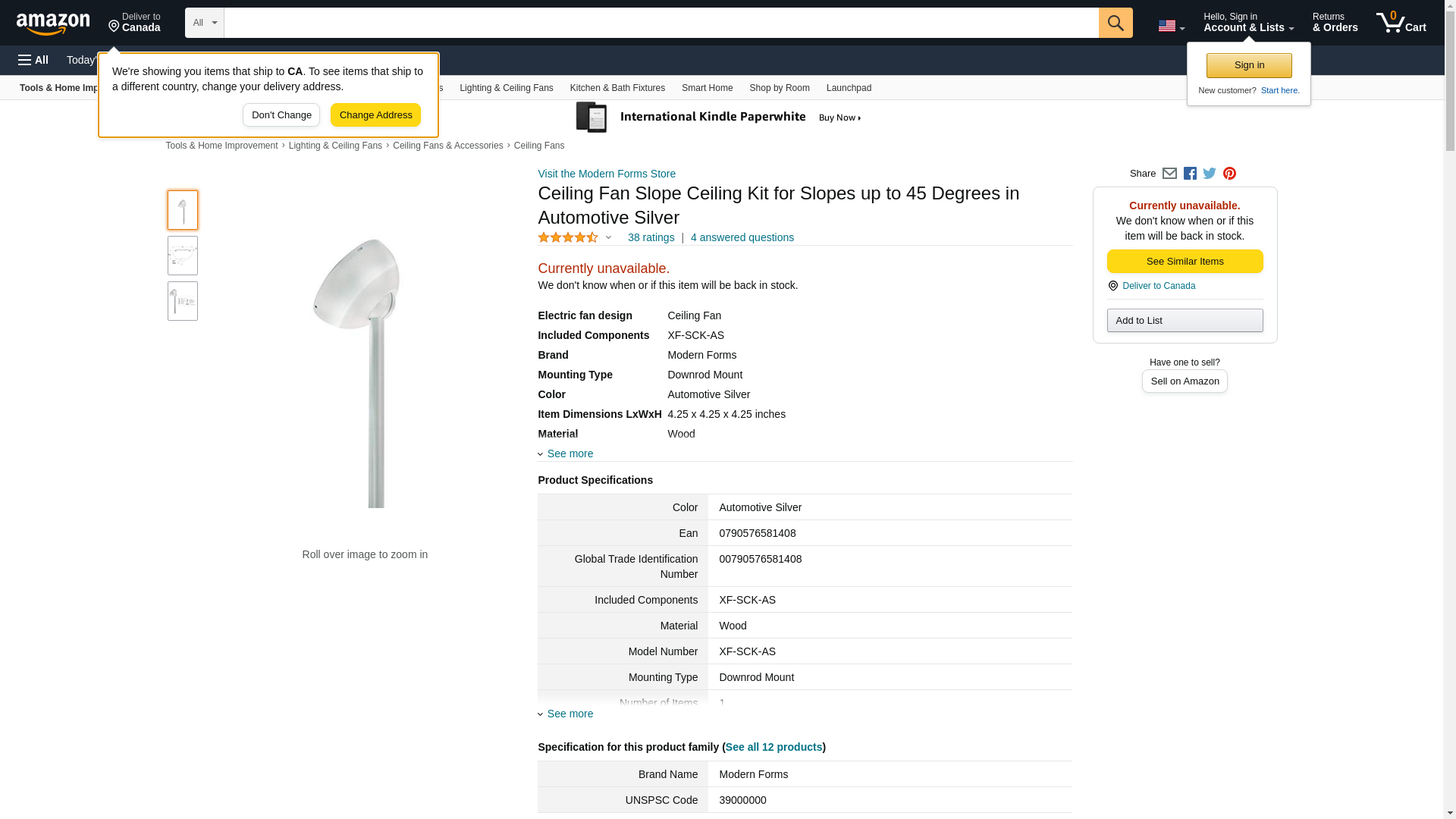 Modern Forms Ceiling Fan Slope Ceiling Kit for Slopes up to 45 Degrees in Automotive Silver Smart Fans