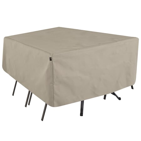 The Chalet Rectangular/Oval Patio Table & Chair Set Cover features a modern aesthetic, with leg ties, designed to keep your patio furniture clean and protected each season. Weather-resistant material helps keep outdoor elements out while an elastic hem cord provides a fast and custom-like fit. PATIO TABLE & CHAIR SET COVER: Fits most rectangular/oval patio table & chairs up to 72-inches long x 44-inches wide x 23-inches high. WEATHER-RESISTANT COVER: Durable, medium-weight, material keeps your patio furniture clean & protected from outdoor elements while excellent UV resistance reduces your cover from fading over time. SECURE PATIO COVER: Leg ties provide a secure, custom-like fit during inclement weather & high winds-not designed to entirely cover wheels or feet. EASY TO CLEAN: Patio furniture cover can be easily spot cleaned with a damp cloth. HOME decor: Neutral beige color matches most home environments & decor.