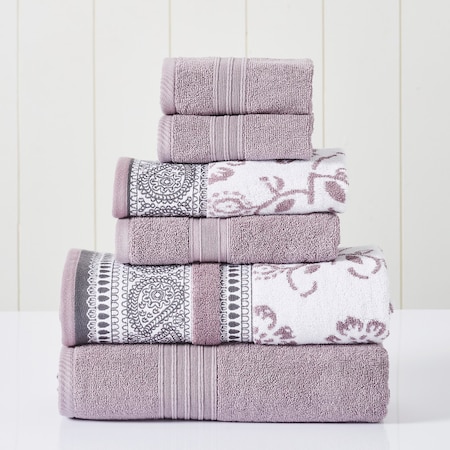 Modern Threads 6 Piece Set, 2 Bath Towels, 2 Hand Towels, 2 Washcloths Yarn Dyed Jacquard/Solid Towel Set Ophelia Orchid