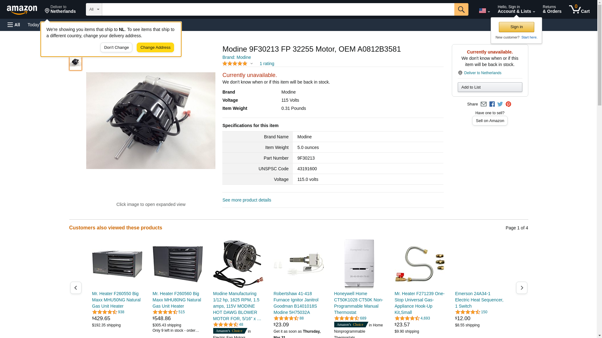 In STOCK Modine 9F30213, FP# 32255, OEM # A0812B3581 Replacement Motor:- OEM # A0812B3581.- 1/12 HP. - 115 Volt / 60 Hz. / 1 Ph. - 1.95 Amps.- 1600 RPM.- With 10 MFD, 370 VAC Motor Start Capacitor.- E62862, LR43381, E62788, E62815, 9F30213A0391.