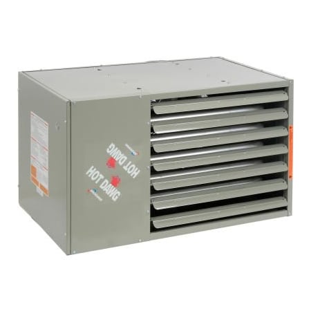 Modine Hot Dawg, HD100AS111SBAN, Gas Fired Unit Heater, 100000 BTUFeatures: Amps: 2.7Color: GrayConstruction: SteelHeight Inches: 21-1/2Length Inches: 35-1/2Type: Non-CombustionWidth Inches: 31Connection Type Inches: 1/2Heat Throw Feet: 42Input (BTU/H): 100000Output (BTU/H): 80000, Lot of 1