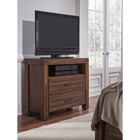 This solid wood product is constructed from Acacia, a sustainable timber known for rich contrasting colors and pronounced grain pattern Finish: Brick Brown; Materials: Acacia; This solid wood product is constructed from Acacia, a sustainable timber known for rich contrasting colors and pronounced grain pattern; Clean-lined modern styling with all solid wood construction, mortise and tenon corners and a vintage finish; Distressed brick brown finish uses wire brushing and rustic glaze to create the warm patina of reclaimed wood ; Simple rectangular bar pulls feature soft edges (1 mm radius) a dark oil rubbed bronze finish; Sanded & stained solid wood drawer boxes with English joinery ensure rigidity and lasting quality; top drawers are felt lined for storing valuables; Frame-and-panel construction, dowel joinery, and tongue-and-groove joinery ensure structural integrity; all wood is kiln dried for added strength and lasting beauty; Side-mount full extension, ball bearing drawer glides for smooth, quiet operation and ample weight capacity; Frame, top, side and front panels are Acacia solid wood; drawer boxes are veneer core hardwood plywood; back panel is MDF, an engineered wood known for exceptional uniformity which ensures the product's structural integrity over time; Please keep in mind that natural wood must breathe and is affected by environmental conditions. You may expect to see some shrinkage or expansion and plank movement over time time. These are normal occurrences that will not affect the structural integrity of the piece--with proper care, this solid wood furniture product should last for generations.; Manufacturer will ship replacement parts at no charge for up to 1 year from date of delivery to correct defects determined at manufacturer's discretion to be related to manufacturing or workmanship; Dust frequently with a clean, lint-free cloth. Avoid using oily polishes or waxes. Avoid exposing your furniture to strong sunlight, heat outlets, open windows o