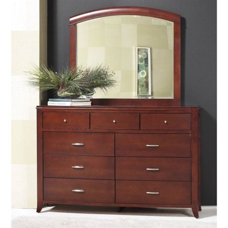 <p>Brighton Dresser & Mirror Set</p> <p>Brighton Nine Drawer Dresser:</p> <ul> <li>English dovetail joints both front and back, corner blocking for rigidity and durability</li> <li>Sanded and stained solid wood drawer boxes with dovetail joinery and felt lined top drawers</li> <li>Constructed from tropical mahogany solids and cherry veneers</li> <li>Bentwood fronts give the piece a soft distinguished shape</li> <li>Full extension ball bearing glides for ease of opening</li> <li>Satin nickel finished pulls add a contemporary touch</li> <li>Width: 63-in - BackToFront: 20-in - Height: 41</li> </ul> <p>Dresser/Wall Mirror:</p> <ul> <li>Solid wood frame</li> <li>Dual function wall or dresser mount mirror</li> <li>Constructed from solid tropical mahogany and beveled glass</li> <li>Crowned top and bead molding carry design elements from collection casegoods</li> <li>Dresser mounting hardware included for mounting with dresser</li> <li>Width: 46-in - Height: 40-in - Thickness: 2</li> </ul> <br />Materials: Tropical Mahogany Solids/Cherry Veneer/Glass <br />Collection: Brighton <br />Dimensions: Width: 63in - Height: 81in - BackToFront: 20inFinish: Cinnamon, <br /> <b>Dimensions:</b> BackToFront: 20in - Height: 81in - Width: 63in