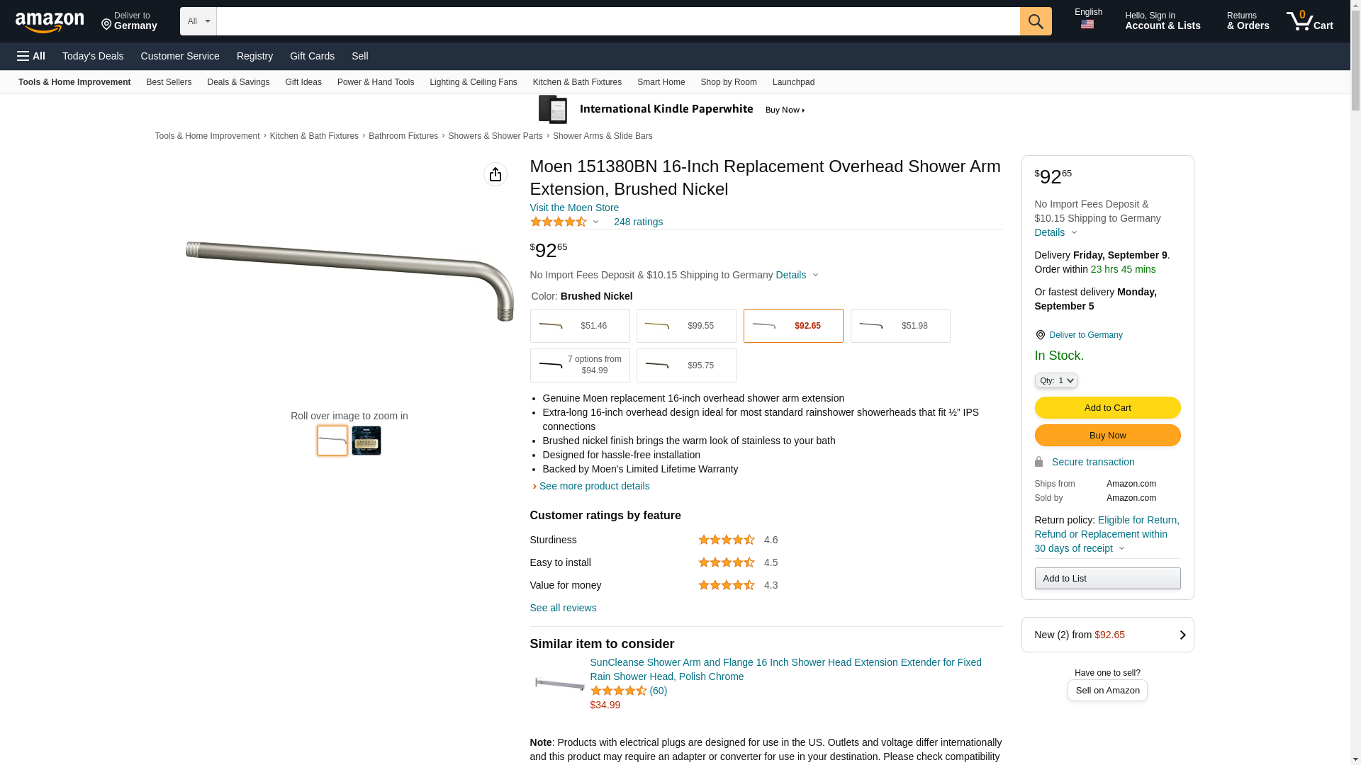 Moen 151380BN 16-Inch Replacement Overhead Shower Arm Extension, Brushed Nickel