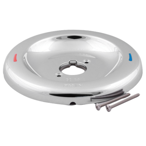 This plate is designed for the MOEN Posi-Temp rough-in valve kit. The chrome finish creates a bright, highly reflective, cool grey metallic look. The plate offers red and blue temperature indicators.