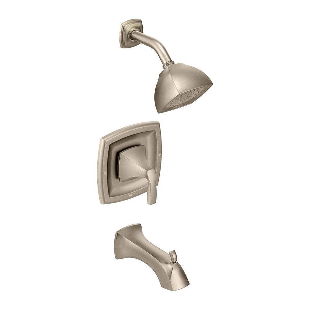 Crisp edges and uncomplicated style features give the Voss collection an ageless, yet fashion-forward, presence. Each silhouette brings a confident transitional style to the bath. This brushed nickel Posi-Temp tub/shower was built to last by MOEN. Designed for use in your bath. This trim kit requires MOEN valve 2510, 2520, 2570, 2580, or 2590 to complete installation.