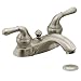 With a low-arc spout design and double lever handles, the MOEN Monticello 4 in. 2-Handle Low-Arc Bathroom Faucet in Brushed Nickel offers classic styling in a warm, metallic brushed nickel finish. This 2-handle bathroom faucet features an easy-to-install centerset design.