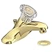 4621P Finish: Polished Brass Features: -Includes metal/polypropylene pop-up type drain assembly. -0.5'' IPS connections. -Knob style handle. -Pull-on/Push-off. Product Type: -Standard bathroom faucet. Finish: -Brass / Antique Brass. Finish: -Chrome. Generic Specifications: -Complies with California Proposition 65 and with the Federal safe water drinking act. Dimensions: Overall Faucet Height: -5.75 Inches. Overall Faucet Width: -6 Inches. Overall Faucet Depth: -3.63 Inches. Maximum Faucet Centers: -4 Inches. Minimum Faucet Centers: -4 Inches. Spout Height: -1.75 Inches. Spout Reach: -3.63 Inches. Overall Product Weight: -3.25 Pounds.