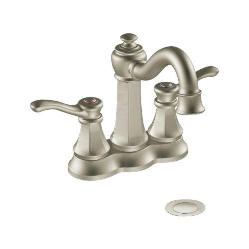 Bathroom Sink Faucet by Moen from the Vestige Collection. Centerset Style Lavatory Faucet with High Arc Spout and Metal Lever Handles. IncLUDEs Metal Drain Assembly and Valve. ADA Compliant. WaterSense Certified. Centers: 4 Inches. 3-Hole Installation. Spout Height: 7 1/4 Inches. Spout Reach: 5 5/8 Inches. Aerator Clearance: 5 Inches. 2.2 GPm. Connections: 1/2 Inches IPS. 6301BN.