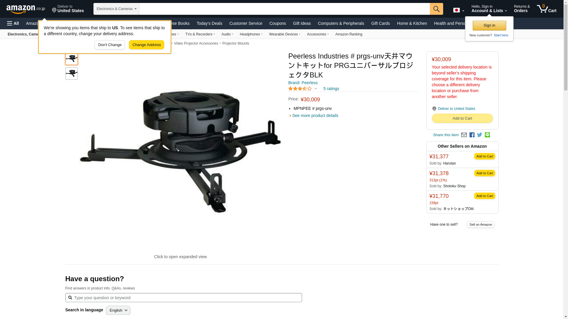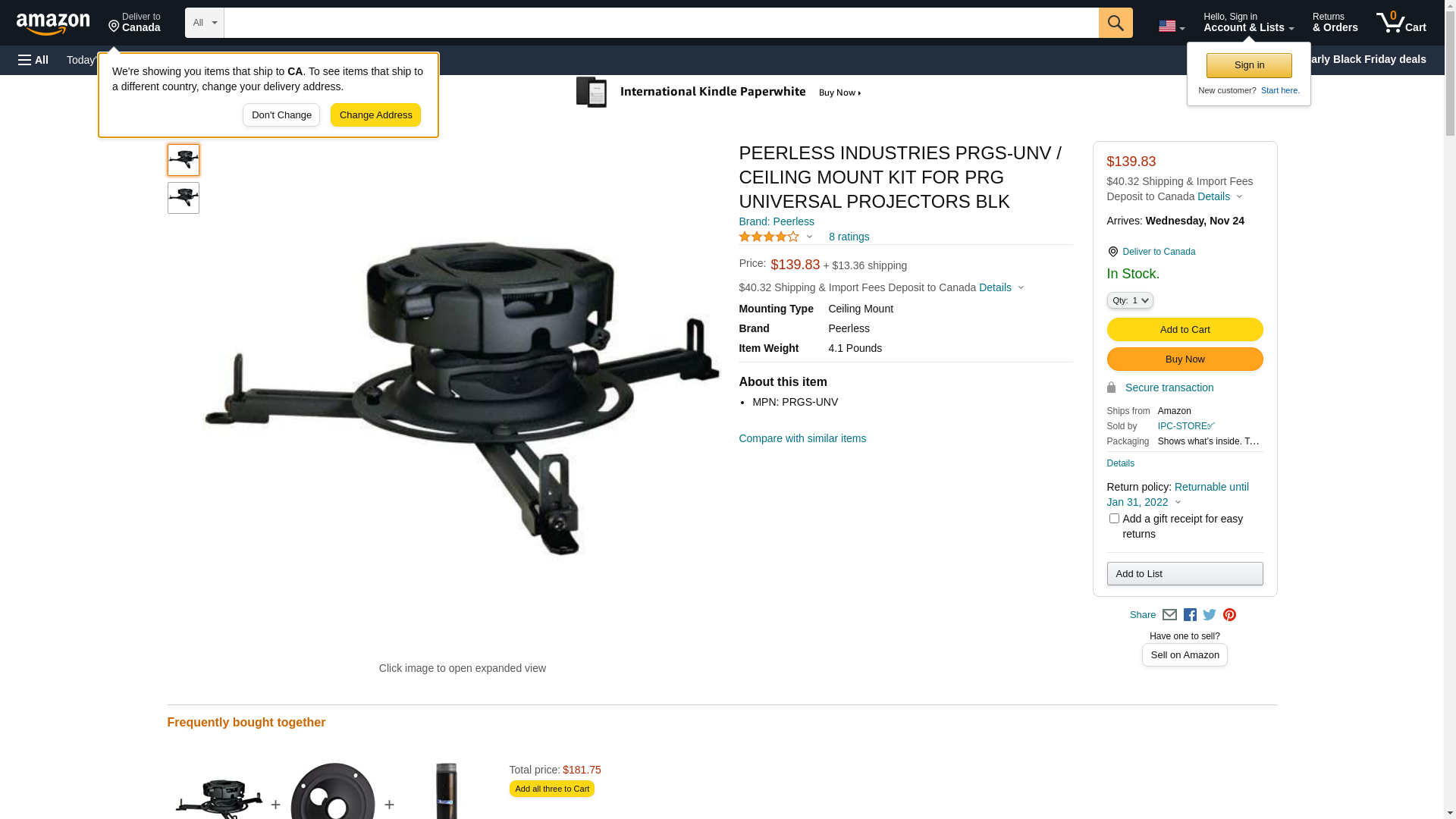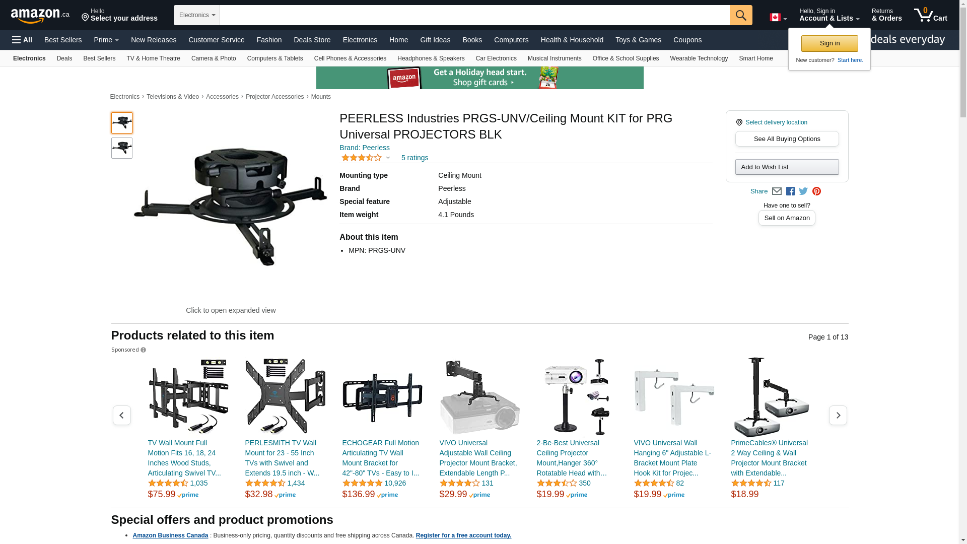 Brand Name: Peerless-AV<br /> Product Series: PRGS<br /> Product Model: PRGS-UNV<br /> Product Name: PRGS Series Projector Mount<br /> Marketing Information: The PRGS Series Projector Mount is simplifying the way image alignment is done. The precision gear design allows exact tilt and roll image positioning by either simply turning two adjustment knobs with a Phillips screw driver, or using the tool-less option by extending the knobs to adjust by hand. Just set the precision gear to the desired position to secure it in place - it will hold its position better than the competition, even during projector maintenance. With Peerless-AV's PRGS Series Projector Mount, just set it and forget it. No more adjustment screws. No more micro adjustments. No more hassles. All projectors with M8 mounting screws require ACC-M8RI inserts for compatibility with any Peerless-AV projector mount, please refer to the Recommended Accessories.<br /> Packaged Quantity: 1<br /> Product Type: Ceiling Mount<br /> Device Supported: Projector<br /> Maximum Load Capacity: 50.00 lb<br /> Features: Tilt, Swivel, Adjustable Height, Adjustable Width, Adjustable Depth, Cable Management<br /> Color: Black<br /> Height: 4.8"<br /> Width: 3.6"<br /> Depth: 4.8"<br /> Weight (Approximate): 2.00 lb<br /> Package Contents:<br /> Projector Mount, Spider, Universal Adapter Plate, Assembly Instructions, Mounting Hardware, Projector Attachment Hardware<br /> Compatibility: Projectors with M8 mounting screws require ACC-M8RI inserts