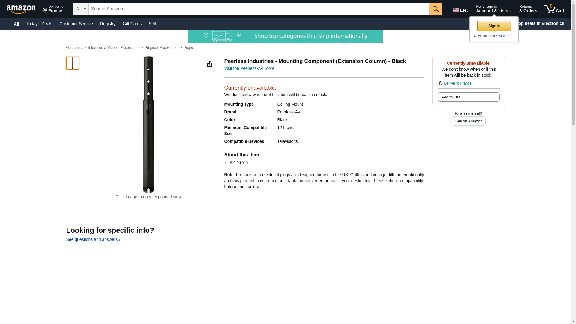ADD0709 Length: 7'-9' Features: -Peerless TV and Projector Ceiling Mounts & Parts collection. -Select the adjustable range to meet your needs. -Notched lower end for safety locking. -Locking, tube-in-tube design. -For use with Peerless ceiling decouplers. -Black fused epoxy finish. Product Type: -Extension column/Extension column accessories. Color: -Black. Generic Specifications: -NOTE: Do not confuse with ADJ model that is used for jumbo mount brackets and ceiling plates.. Dimensions: -Adjustable at 1'' increments. Length 12"-18" - Overall Height - Top to Bottom: -18". Length 12"-18" - Overall Width - Side to Side: -1.9". Length 12"-18" - Overall Depth - Front to Back: -1.9". Length 12"-18" - Overall Product Weight: -4.5 lbs. Length 18"-24" - Overall Height - Top to Bottom: -24". Length 18"-24" - Overall Width - Side to Side: -1.9". Length 18"-24" - Overall Depth - Front to Back: -1.9". Length 18"-24" - Overall Product Weight: -3 lbs. Length 2'-3' - Overall Height - Top to Bottom: -24". Length 2'-3' - Overall Width - Side to Side: -1.9". Length 2'-3' - Overall Depth - Front to Back: -1.9". Length 2'-3' - Overall Product Weight: -8 lbs. Length 10'-12' - Overall Height - Top to Bottom: -120". Length 10'-12' - Overall Width - Side to Side: -1.9". Length 10'-12' - Overall Depth - Front to Back: -1.9". Length 10'-12' - Overall Product Weight: -28 lbs.