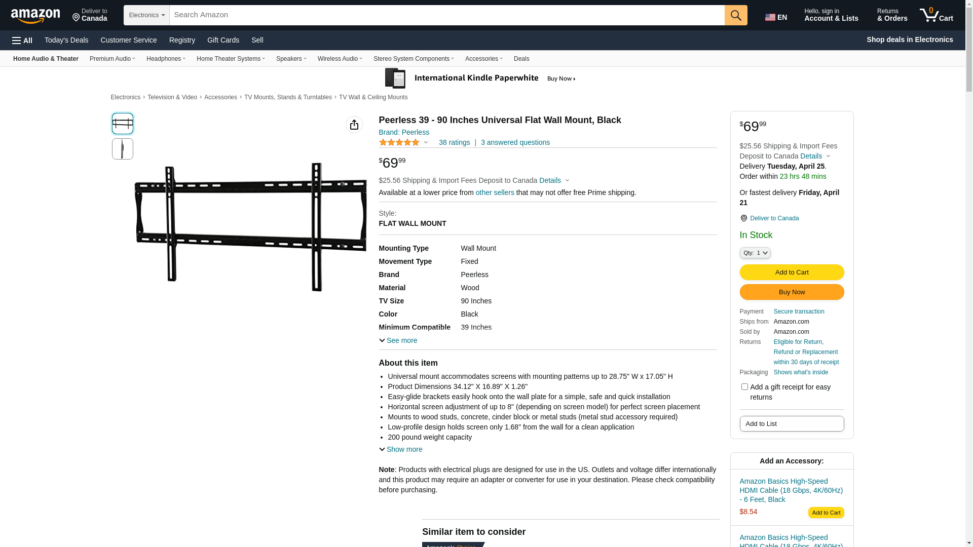 Peerless 39 - 90 Inches Universal Flat Wall Mount, Black