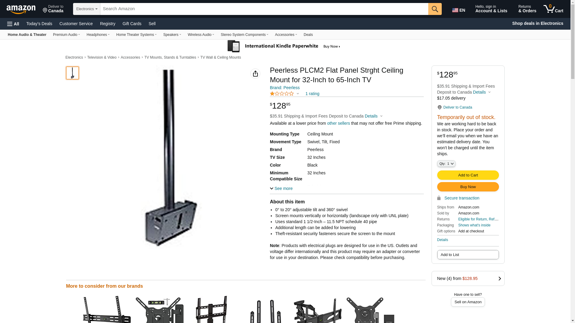 Peerless PLCM2 Flat Panel Strght Ceiling Mount for 32-Inch to 65-Inch TV. 0° to 20° adjustable tilt and 360° swivel. ...