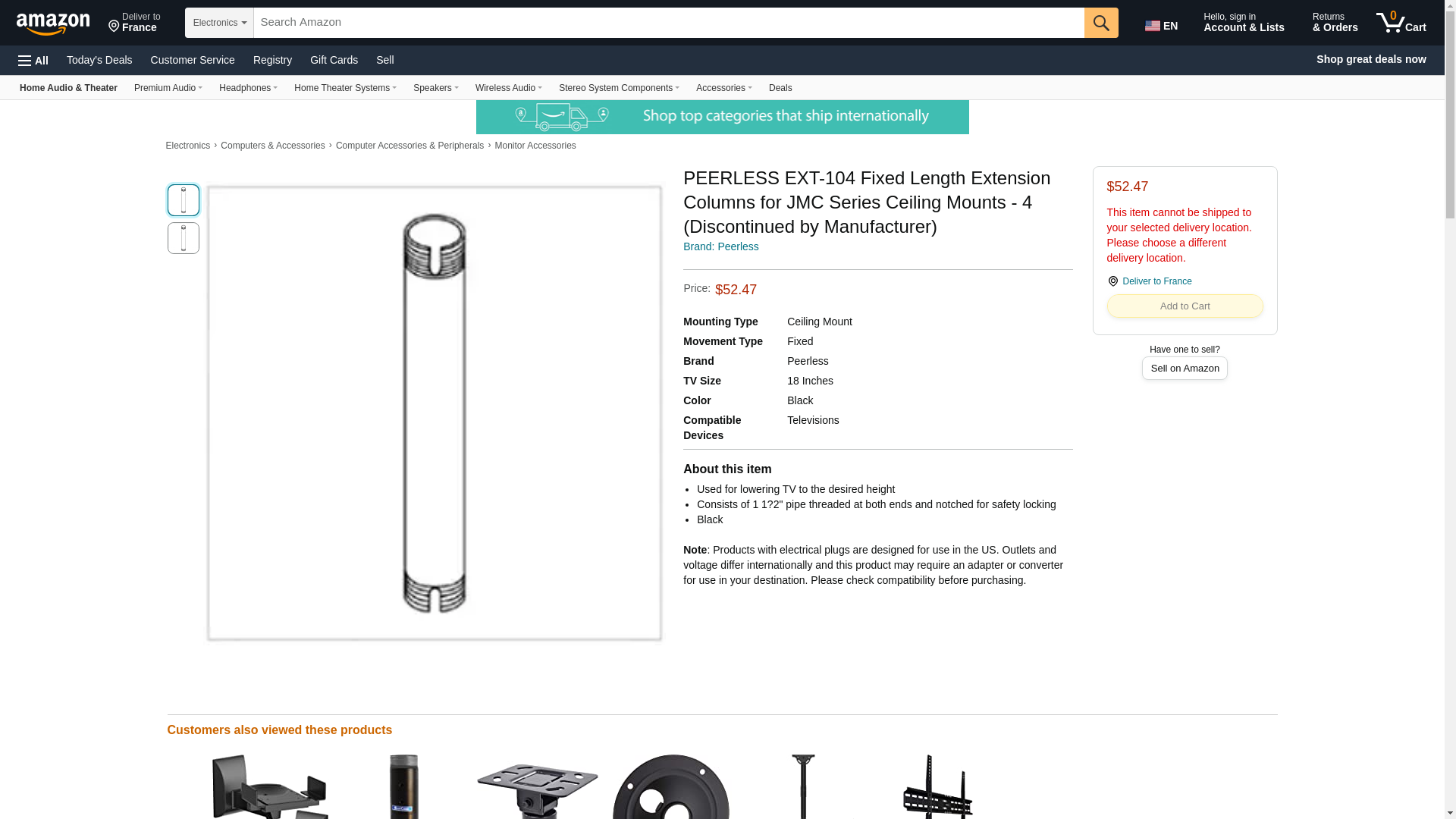EXT104 Length: 4', Color: Black Features: -Consist of 1.5'' NPT schedule 40 pipe, which is threaded on both ends. -Notched on both ends for safety locking. -For Peerless Ceiling Mounts. Product Type: -Extension column/Extension column accessories. Dimensions: -NOTE: Length options refer to drop distance, actual column length with threads adds roughly 3.5''. Length 18" - Overall Height - Top to Bottom: -216". Length 18" - Overall Width - Side to Side: -1.9". Length 18" - Overall Depth - Front to Back: -1.9". Length 18" - Overall Product Weight: -8.49 lbs. Length 1' - Overall Height - Top to Bottom: -12". Length 1' - Overall Width - Side to Side: -1.9". Length 1' - Overall Depth - Front to Back: -1.9". Length 1' - Overall Product Weight: -8.49 lbs. Length 2' - Overall Height - Top to Bottom: -24". Length 2' - Overall Width - Side to Side: -1.9". Length 2' - Overall Depth - Front to Back: -1.9". Length 2' - Overall Product Weight: -8.49 lbs. Length 10' - Overall Height - Top to Bottom: -120". Length 10' - Overall Width - Side to Side: -1.9". Length 10' - Overall Depth - Front to Back: -1.9". Length 10' - Overall Product Weight: -8.49 lbs.