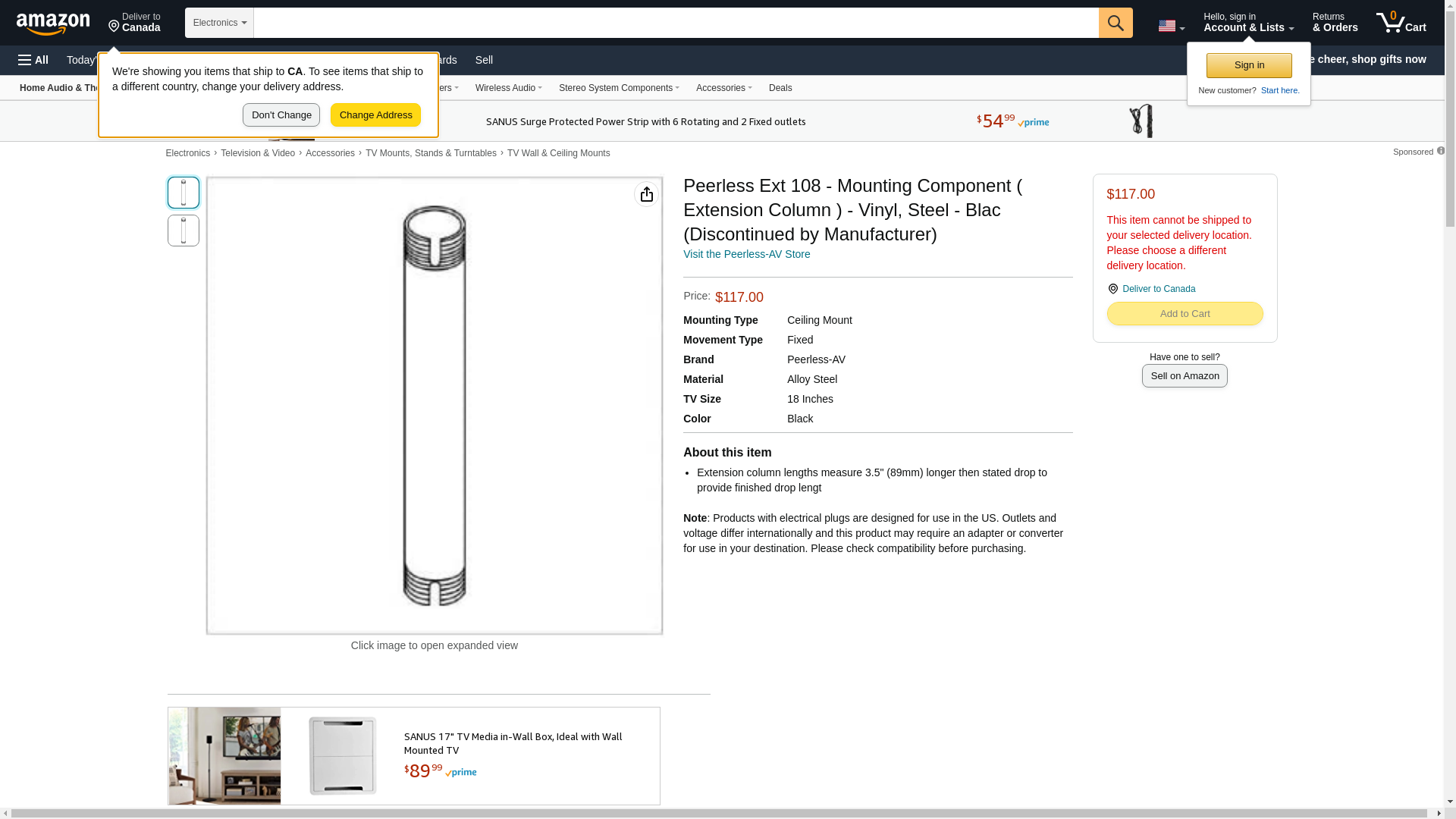 Peerless Ext 108 - Mounting Component ( Extension Column ) - Vinyl, Steel - Blac (Discontinued by Manufacturer)