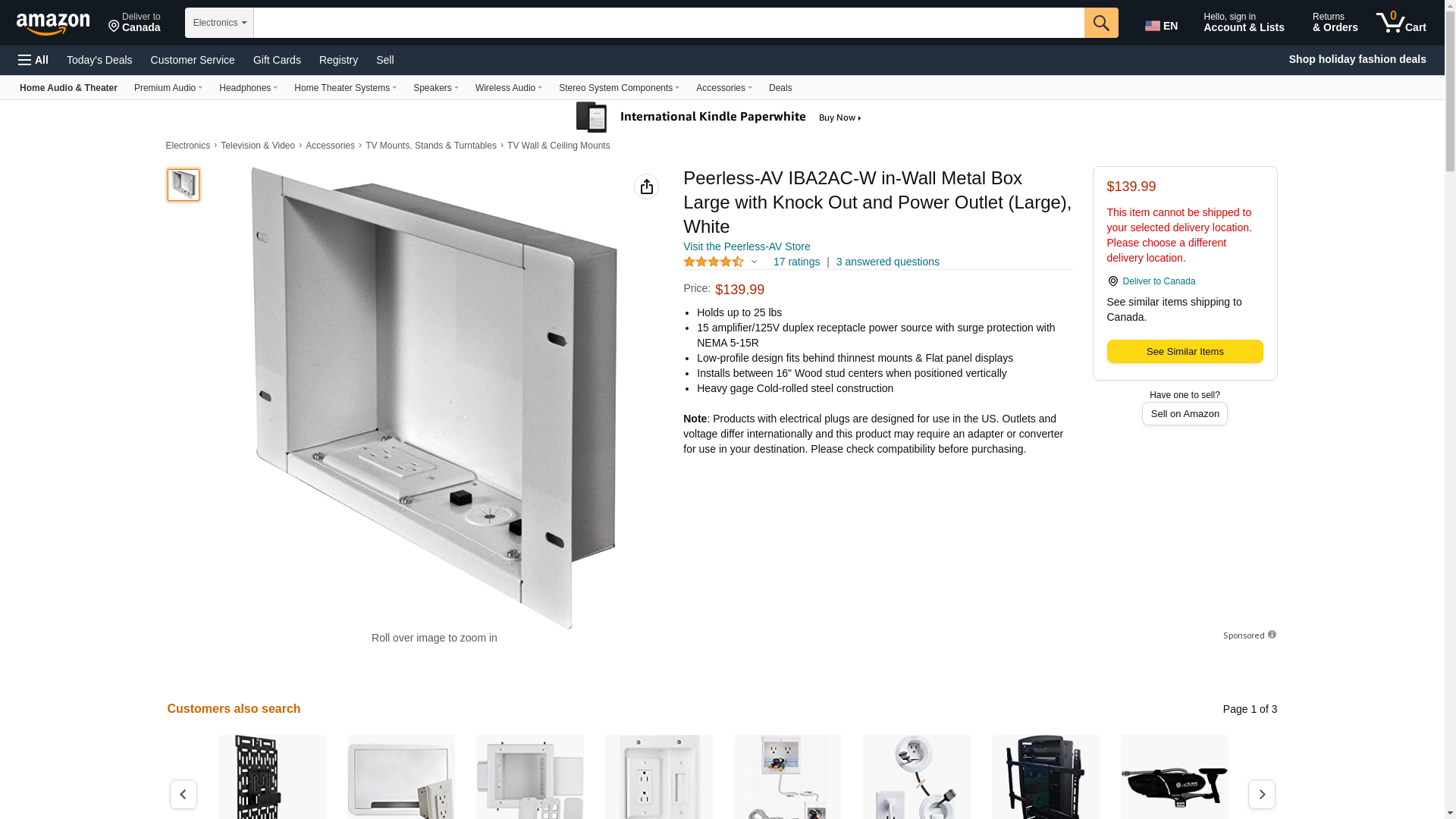PEERLESS-AV IBA2AC-W In-Wall Metal Box Large with Knock Out & Power Outlet (L...